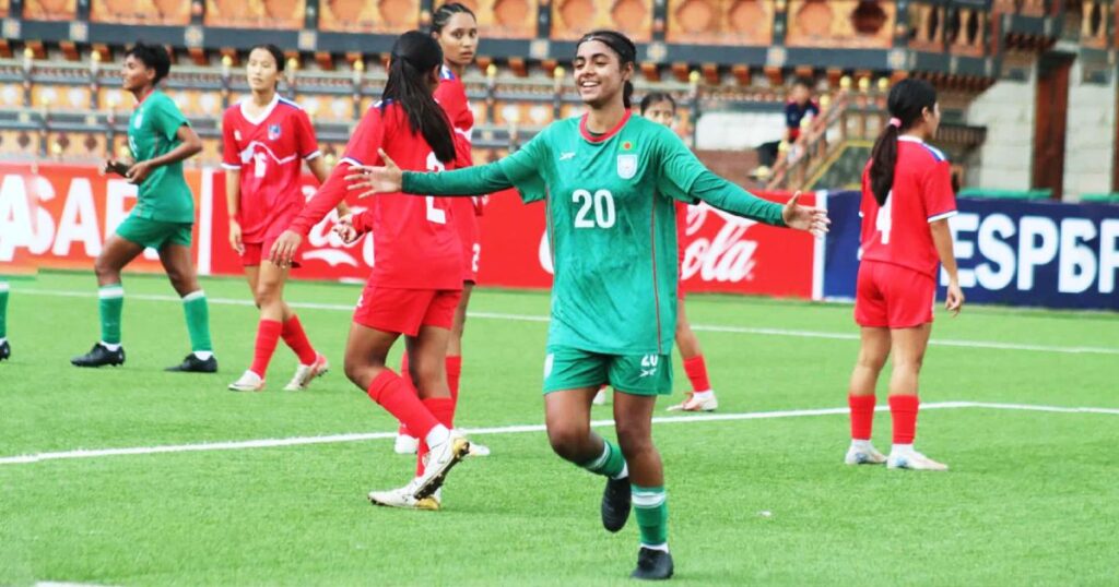 সাফ অনূর্ধ্ব-১৭ মহিলা ফুটবল চ্যাম্পিয়নশিপের মূল আর্সেনালে বাংলাদেশের মেয়েরা আরও একবার প্রমাণ করলেন নিজেদের শক্তি ও ক্ষমতা। সুরভী আকন্দ প্রীতির হ্যাটট্রিকের কল্যাণে বাংলাদেশ দল ৪-১ গোলে নেপালকে পরাজিত করেছে। এই ম্যাচটি অনুষ্ঠিত হয় গতকাল বুধবার ভুটানের চাংলিমিথাং স্টেডিয়ামে, যেখানে বাংলাদেশ দলের প্রতিরোধ ও আক্রমণে ছিল দারুণ উত্তেজনা।