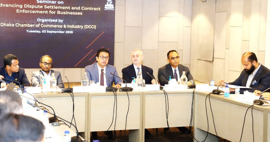 ঢাকা চেম্বার অব কমার্স অ্যান্ড ইন্ডাস্ট্রির (ডিসিসিআই) সভাপতি তাসকীন আহমেদ বলেছেন, বিদেশি বিনিয়োগ আকর্ষণে একটি বিশেষায়িত ‘কমার্শিয়াল কোর্ট’ স্থাপন ও আইনি প্রক্রিয়ার সংস্কার অপরিহার্য। তিনি একথা বলেন, যখনই বাণিজ্য বিরোধের দীর্ঘসূত্রিতা হোতা, তখন তা বিদেশি বিনিয়োগের জন্য ব্লক হয়ে দাঁড়ায়। এর পাশাপাশি দেশে সামগ্রিক অর্থনৈতিক কার্যক্রমের প্রবৃদ্ধির সাথে সাথে ব্যবসায়িক চুক্তি, বিনিয়োগ এবং মেধাস্বত্ত্ববিষয়ক বিরোধের সংখ্যাও ক্রমাগত বাড়ছে। এই পরিস্থিতিতে বাণিজ্য ও বিনিয়োগে গতি বাড়ানোর জন্য একটি আলাদা কমার্শিয়াল কোর্ট চালু ও আইনি প্রক্রিয়ার সংস্কার একান্ত প্রয়োজন। মঙ্গলবার রাজধানীর মতিঝিলের ডিসিসিআই অডিটোরিয়ামে ‘ব্যবসায় বিরোধ নিষ্পত্তি ও চুক্তি বাস্তবায়নের অগ্রগতি’ শীর্ষক সেইমিনারে তিনি এসব কথা বলেন। এতে প্রধান অতিথি ছিলেন বাণিজ্য মন্ত্রণালয়ের সচিব মাহবুবুর রহমান। সাথে ছিলেন ইউরোপীয় ইউনিয়নের রাষ্ট্রদূত মাইকেল মিলার, বাণিজ্য বিভাগের অতিরিক্ত সচিব মো. আবদুর রহিম খান ও অন্যান্য অতিথি। বাণিজ্য সচিব মাহবুবুর রহমান উল্লেখ করেন, জনসংখ্যা বহুপ্রাণ এই দেশে আদালতে মামলার সংখ্যা দিন দিন বাড়ছে, যার ফলে বিচার প্রক্রিয়ার দীর্ঘতা আরও বেড়ে গেছে। এতে করে দেশের বিনিয়োগকারীদের পাশাপাশি বিদেশি বিনিয়োগও ব্যাহত হচ্ছে। তিনি জানিয়েছেন, ২০০১ সালে আরবিট্রেশন আইন চালু হলেও, বাণিজ্য পরিবেশ উন্নত হয়নি। ভবিষ্যতে বাণিজ্য বিরোধ সমাধানে প্রথাগত আদালতের বাইরে গিয়ে সমাধান পর্যায়ে পৌছানো গেলে, আদালত ও ব্যবসা দুই পক্ষই উপকৃত হবে। তিনি আশা প্রকাশ করেন, শিগগিরই একটা কার্যকর কমার্শিয়াল কোর্টের খসড়া চূড়ান্ত করা সম্ভব হবে এবং এজন্য বিশেষজ্ঞ বিচারকদের নিয়োগ ও আইনি সংস্কারের ওপর গুরুত্ব দেওয়া হবে। ইউরোপীয় ইউনিয়নের রাষ্ট্রদূত মাইকেল মিলার বলেন, বাংলাদেশ সরকারের সঙ্গে ইইউ খুব আনন্দের সঙ্গে এই আইনি সংস্কার প্রক্রিয়ায় কাজ করছে। এর ফলে দেশের মানুষের জীবনমান উন্নত হবে বলে মনে করেন তিনি। বাণিজ্য মন্ত্রণালয়ের অতিরিক্ত সচিব মো. আবদুর রহিম খান জানান, দেশের বৃহৎ জনসংখ্যার জন্য আদালতে মামলা ও বিচারের দীর্ঘসূত্রিতা মনোয়োভাবের উপর নেতিবাচক প্রভাব ফেলছে। এর ফলে বিদেশি বিনিয়োগও কমে যাচ্ছে। তিনি বলেন, ২০০১ সালে চালু হওয়া আরবিট্রেশন আইনের যথাযথ বাস্তবায়ন হওয়ায় দেশের বাণিজ্য পরিবেশ হবে আরও উন্নত। তিনি জানিয়েছেন, শিগগিরই কমার্শিয়াল কোর্টের খসড়া অনুমোদনের জন্য প্রস্তুত, যেখানে বিচারকের পরামর্শ এবং আইনি সংস্কার দরকার। বাংলাদেশে নিযুক্ত ইউরোপীয় ইউনিয়নের রাষ্ট্রদূত মাইকেল মিলার বলেন, বিদেশি বিনিয়োগ আকর্ষণে আই