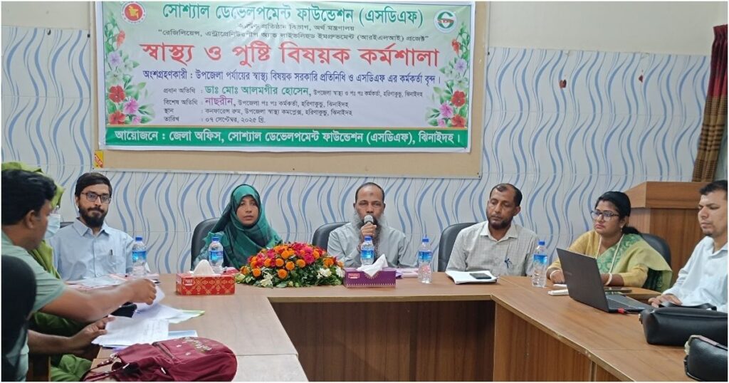 ঝিনাইদহে স্বাস্থ্য ও পুষ্টি বিষয়ক এক গুরুত্বপূর্ণ কর্মশালা অনুষ্ঠিত হয়েছে, যার উদ্দেশ্য হলো সরকারি স্বাস্থ্যসেবাকে সহজলভ্য করে গর্ভকালীন মহিলাদের মাতৃ mortality হার, শিশু অপুষ্টি ও সংক্রামক রোগের সংক্রমণ কমানো। রোববার সকালে হরিণাকুন্ডু উপজেলা স্বাস্থ্য কমপ্লেক্সের মিলনায়তনে এই কর্মশালার আয়োজন করে অর্থ মন্ত্রণালয়ের আর্থিক প্রতিষ্ঠান বিভাগ সোশ্যাল ডেভেলপমেন্ট ফাউন্ডেশন (এসডিএফ)। অনুষ্ঠানে জেলার উপজেলা স্বাস্থ্য ও পরিবার পরিকল্পনা কর্মকর্তা ডা. আলমগীর হোসেন, পরিবার পরিকল্পনা কর্মকর্তা নাছরীন, এসডিএফ-এর জেলা ব্যবস্থাপক মাহমুদ হাসান, জেলা স্বাস্থ্য ও পুষ্টি কর্মকর্তা ডা. অনুদীপা রানী, আইটি ও এসআইএস মো. সাদ আহম্মেদ, ক্লাস্টার অফিসার বাণী বৈরাগীসহ অন্যান্য কর্মকর্তারা বক্তৃতা করেন। এর মাধ্যমে স্থানীয় স্বাস্থ্য বিভাগের সরকারি প্রতিনিধিরা ও এসডিএফ-এর কর্মকর্তারা পুষ্টি ও স্বাস্থ্যের সেবা সহজ করার বিভিন্ন গুরুত্বপূর্ণ দিক তুলে ধরেন। কর্মশালায় খাদ্য ও পুষ্টি, অপুষ্টির প্রতিকার, কিশোর-কিশোরীদের পুষ্টির গুরুত্ব, ইপিআই কর্মসূচির মাধ্যমে রোগ প্রতিরোধ, স্বাস্থ্যসম্মত হাত ধোয়ার অভ্যাস এবং বসতভিটায় পুষ্টিবাগান স্থাপনের মাধ্যমে খাদ্য নিরাপত্তা নিশ্চিত করার বিষয়গুলো আলোচনা হয়। এই কর্মশালা স্বাস্থ্য ও পুষ্টি বিষয়ে সচেতনতা বৃদ্ধি করে দ্রুত বাস্তবায়নের জন্য প্রশিক্ষণ প্রদানসহ গুরুত্বপূর্ণ ভূমিকা পালন করে। অংশগ্রহণকারীদের সচেতনতা বাড়ানোর পাশাপাশি তাদের জীবনে কার্যকরভাবে এই জ্ঞান প্রয়োগের জন্য বিভিন্ন প্রশিক্ষণও দেওয়া হয়।