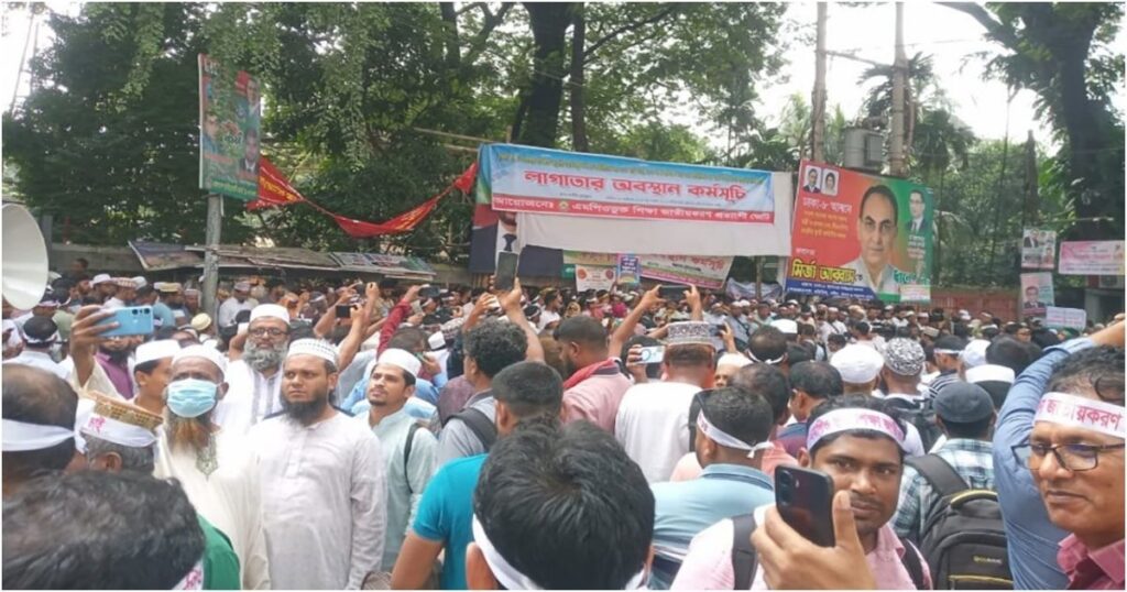 শিক্ষা উপদেস্টার সরকারের প্রতিশ্রুতির ভিত্তিতে এমপিওভুক্ত শিক্ষক ও কর্মচারীদের জন্য ২০ শতাংশ বাড়ি ভাড়া, ১৫০০ টাকা মেডিকেল ভাতা এবং ৭৫ শতাংশ উৎসব ভাতার প্রজ্ঞাপন জারি করার দাবিতে বেগবান আন্দোলন চালিয়ে যাচ্ছে এমপিওভুক্ত শিক্ষক-শিক্ষাব্রতী সংগঠনগুলো। রোববার সকাল ১০টার পর থেকে জাতীয় প্রেসক্লাবের সামনের সড়কে অবস্থান নেয় হাজারো শিক্ষক ও কর্মচারী, যা ব্যাপক সংখ্যায় সারা দেশের সংগঠিত অংশগ্রহণের কারণে সড়কে যানচলাচল বন্ধ হয়ে যায়। এর পাশাপাশি, জাতীয় প্রেসক্লাব, সচিবালয় ও মেট্রোরেল স্টেশনের প্রবেশপথে সাধারণ মানুষের চলাচল মারাত্মকভাবে বিঘ্নিত হচ্ছে। আন্দোলনকারীরা জানান, প্রজ্ঞাপন জারি না হওয়া পর্যন্ত তাদের অবস্থান চলমান থাকবে, এবং পরিস্থিতির অবনতির কারণে জোটের মহাসচিব দেলাওয়ার হোসেন আজিজী বলেছেন, ভবিষ্যতে লাগাতার কর্মবিরতির সম্ভাবনাও রয়েছে। উল্লেখ্য, গত ১৩ আগস্ট জাতীয় প্রেসক্লাবে শিক্ষক সমাবেশে লক্ষাধিক শিক্ষক-কর্মচারী জমায়েত হয় και শিক্ষা উপদেষ্টা আশ্বাস দেন, এমপিওভুক্ত শিক্ষক-কর্মচারীদের জন্য বেসিকের ২০ শতাংশ বাড়ি ভাড়া, ১৫০০ টাকা চিকিৎসা ভাতা ও উৎসব ভাতা বৃদ্ধির প্রতিশ্রুতি। কিন্তু দুই মাসের বেশি সময় পার হলেও এই প্রতিশ্রুতির প্রজ্ঞাপন এখনো জারি হয়নি, যাের ফলে ক্ষুব्ध শিক্ষকরা আন্দোলন জোরদার করেছেন। সূত্র জানায়, আন্দোলনের চাপের মুখে অর্থ মন্ত্রণালয়ে ৫ অক্টোবর একটি নতুন প্রস্তাব পাঠানো হয়, যেখানে বাড়ি ভাড়া ২০ শতাংশ নির্ধারণ ও উৎসব ভাতার শতকরা হার ৭৫ ভাগে উন্নীত করার প্রস্তাব রয়েছে। একইসঙ্গে, মেডিকেল ভাতাও এক হাজার টাকা করতে সম্মত হয়েছে শিক্ষা উপদেষ্টা। তবে আন্দোলন চালিয়ে যেতে এই দাবিগুলোর বাস্তবায়নের জন্য সংগঠনের পক্ষ থেকে কঠোরভাবে বহাল থাকছে।