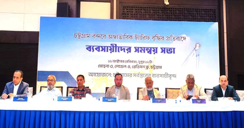 চট্টগ্রাম বন্দরের সম্প্রসারিত ট্যারিফ ব্যবস্থা স্থগিত করার জন্য জোরালো দাবি জানিয়েছেন চট্টগ্রামের ব্যবসায়ীরা। শনিবার রাতে রেডিসন ব্লু বু ভিউতে এক গুরুত্বপূর্ণ ব্যবসায়ী সমন্বয় সভায় বক্তারা এই দাবি তুলেছেন। তারা বলেছেন, অস্বাভাবিক হারে বৃদ্ধি পাওয়া ট্যারিফের বিরুদ্ধে সাধারণ ব্যবসায়ীদের অংশগ্রহণে আলোচনা না করে সিদ্ধান্ত নেওয়া ঠিক নয়, তাই এই ট্যারিফ বন্ধ করার উচিত।