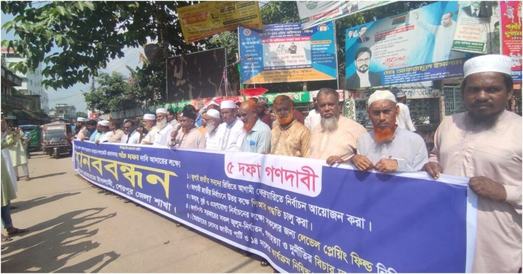 scourge এই সূত্রে, ১৫ অক্টোবর বুধবার সকালে শেরপুর জেলা প্রশাসকের কার্যালয়ের মূল গেইটে জামায়াতে ইসলামির উদ্যোগে এক মানববন্ধন অনুষ্ঠিত হয়েছে। এই মানববন্ধনে উপস্থিত ছিলেন জেলা জামায়াতের আমির মাও: হাফিজুর রহমান, জেলা সেক্রেটারি নুরুজ্জামান বাদল, সাবেক নায়েবে আমির মাও: আব্দুল বাতেনসহ দলের অন্যান্য নেতাকর্মীরা। বক্তারা উল্লেখ করেন, দেশের নির্বাচন ব্যবস্থা পুনরুদ্ধার এবং জুলাই সনদ কার্যকর করতে হলে পিআর পদ্ধতিতে নির্বাচন ও সেইসঙ্গে দেশের সামগ্রিক পরিস্থিতি পরিবর্তনের জন্য আন্দোলন চালিয়ে যেতে হবে। তারা সরকারের কাছে পাঁচ দফা দাবি মানার আহ্বান জানান, যার মধ্যে অন্যতম হলো পিআর পদ্ধতিতে নির্বাচন কার্যকর করা ও ২০০৭ সালের जुलाई সনদ বাস্তবায়ন। বক্তারা বলেন, এই তিনটি শর্ত পূরণ না হওয়া পর্যন্ত তারা আন্দোলন চালিয়ে যাবেন। নিজেদের দাবি আদায়ে তারা সকলের সহযোগিতা ও ঐক্যের জন্য আহ্বান জানান।