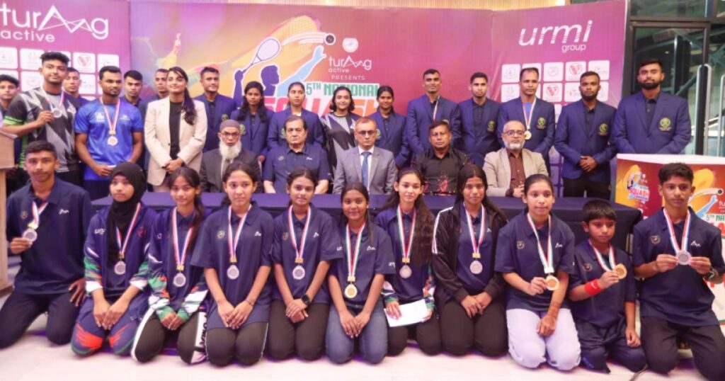 এক জাকজমকপূর্ণ আয়োজনের মাধ্যমে ৫ম জাতীয় স্কোয়াশ চ্যাম্পিয়নশিপ ২০২৫ এর সমাপনী ও পুরস্কার বিতরণী অনুষ্ঠান অনুষ্ঠিত হয়েছে বৃহস্পতিবার বসুন্ধরা স্পোর্টস সিটির জুলকান ইনডোর এরেনায়। এই প্রতিযোগিতায় বিভিন্ন বিভাগে বিজয়ীরা তাদের প্রতিভা ও দক্ষতা প্রদর্শন করেছেন। মেয়েদের শাখায় অনুর্ধ ১৩ গ্রুপে চ্যাম্পিয়ন হয়েছেন অনুরোধালা সুলতানা, অনুর্ধ ১৫ গ্রুপে মায়ানুর, উন্মুক্ত মহিলা গ্রুপে চাঁদনী সরকার। ছেলেদের শাখায় অনুর্ধ ১৩ গ্রুপে শাহীর্ন নাফিজ, অনুর্ধ ১৫ গ্রুপে মেহেদি হাসান, পুরুষ উন্মুক্ত গ্রুপের শাখায় জিতেছেন শাহাদাৎ হোসেন। পাশাপাশি মেম্বার গ্রুপের চ্যাম্পিয়ন হিসেবে গেরেসচর্গামী ক্লাবের ফজলে ওয়ালি ও বিশেষ পুরস্কার জিতেছেন ঢাকা স্কোয়াশ একাডেমির জিহাদ। বিজয়ীদের হাতে ট্রফি তুলে দেন যুব ও ক্রীড়া মন্ত্রণালয়ের সচিব মোঃ মাহবুব-উল-আলম।