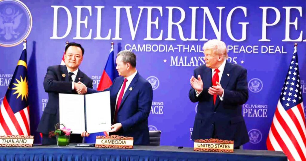 দক্ষিণ-পূর্ব এশিয়ার দুই দেশ, থাইল্যান্ড ও কম্বোডিয়া, একটি গুরুত্বপূর্ণ যুদ্ধবিরতি চুক্তিতে স্বাক্ষর করেছে। এর মাধ্যমে দীর্ঘ দিন ধরে চলা সীমান্ত সংকট সমাধানের পথে এগিয়ে গেছে এ অঞ্চল। এই ঐতিহাসিক চুক্তি স্বাক্ষর অনুষ্ঠানে উপস্থিত ছিলেন মার্কিন প্রেসিডেন্ট ডোনাল্ড ট্রাম্প, যিনি নিজেও চুক্তিপত্রে স্বাক্ষর করেছেন। এ সময় মালয়েশিয়ার প্রধানমন্ত্রী আনোয়ার ইব্রাহিমও উপস্থিত ছিলেন। বার্তাসংস্থাএএফপি জানিয়েছে, রোববার এই চুক্তি স্বাক্ষরিত হয় মালয়েশিয়ায় অনুষ্ঠিত এশিয়া সফরের প্রথম ধাপের অংশ হিসেবে। সাম্প্রতিক সীমান্ত সংঘাতের পর এই চুক্তি গুরুত্বপূর্ণ এক মোড়ের সূচনা নির্দেশ করে। ট্রাম্পের উপস্থিতিতে, থাই প্রধানমন্ত্রী অনুতিন চার্নভিরাকুল ও কম্বোডিয়ার প্রধানমন্ত্রী হুন মানেত চুক্তিতে স্বাক্ষর করেন। এর আগে, রোববারই মালয়েশিয়ায় পৌঁছান ট্রাম্প, যেখানে তিনি এশিয়া সফর শুরু করেন। দেশটিতে আসিয়ান শীর্ষ সম্মেলনে যোগ দিয়ে তিনি জাপান ও দক্ষিণ কোরিয়াও সফর করবেন। তবে এই সফরের সবচেয়ে আলোচিত অংশ হতে যাচ্ছে চীনের প্রেসিডেন্ট শি চিন পিংয়ের সঙ্গে ট্রাম্পের বৈঠক। এই বৈঠকে সম্ভাব্য বাণিজ্য চুক্তি নিয়ে আলোচনা হবে, যা দু দেশের মধ্যে চলমান বাণিজ্যযুদ্ধের অবসানে গুরুত্বপূর্ণ অবদান রাখতে পারে বলে মনে করা হচ্ছে। ট্রাম্প বিমান থেকে সাংবাদিকদের বলেন, তিনি আশাবাদী যে চীন নতুন চুক্তিতে রাজি হবে, যেন আগামী ১ নভেম্বর থেকে কার্যকর হতে যাচ্ছে অতিরিক্ত ১০০ শতাংশ শুল্ক আরোপের ব্যবস্থা বন্ধ হয়। এর সঙ্গে সঙ্গে ট্রাম্পের পরিকল্পনায় রয়েছে উত্তর কোরিয়ার নেতা কিম জং উনের সঙ্গে এক সাক্ষাতের সম্ভাবনা, যা হতে পারে এই প্রথম পরের বছর ২০১৯ সালের পর। মালয়েশিয়া সফর শেষ করে সোমবার ট্রাম্প জাপানে পৌঁছাবেন, যেখানে তিনি জাপানের নতুন প্রধানমন্ত্রী সানায়ে তাকাইচির সঙ্গে বৈঠক করবেন। তিনি তাকাইচিকে ‘চমৎকার একজন নেতা’ বলে প্রশংসা করেছেন এবং বলেন, এটি মার্কিন-জাপানি সম্পর্কের জন্য ইতিবাচক। তাকাইচি সম্প্রতি ট্রাম্পকে ফোনে জানিয়েছেন যে, তার সরকারের প্রধান কূটনৈতিক লক্ষ্য যুক্তরাষ্ট্রের সঙ্গে জোট আরও শক্তিশালী করা। এরপর, ট্রাম্প আগামী বুধবার দক্ষিণ কোরিয়ার বুসান পৌঁছাবেন, যেখানে তিনি এপেক সম্মেলনে অংশ নেবেন এবং দক্ষিণ কোরিয়ার প্রেসিডেন্ট লি জে মিয়ংয়ের সঙ্গে বৈঠক করবেন। শেষ পর্যায়ে, বৃহস্পতিবার তিনি চীনা প্রেসিডেন্ট শি চিন পিংয়ের সঙ্গে বৈঠক করবেন। এই বৈঠকটি আলাদাভাবে গুরুত্বপূর্ণ, কারণ এটি হতে পারে ট্রাম্পের ক্ষমতা ফিরিয়ে আসার পর শি চিন পিংয়ের সঙ্গে প্রথম মুখোমুখি সাক্ষাৎ। দুই নেতা এই বৈঠকে চলমান বাণিজ্যযুদ্ধের সমাধান নিয়ে আলোচনা 