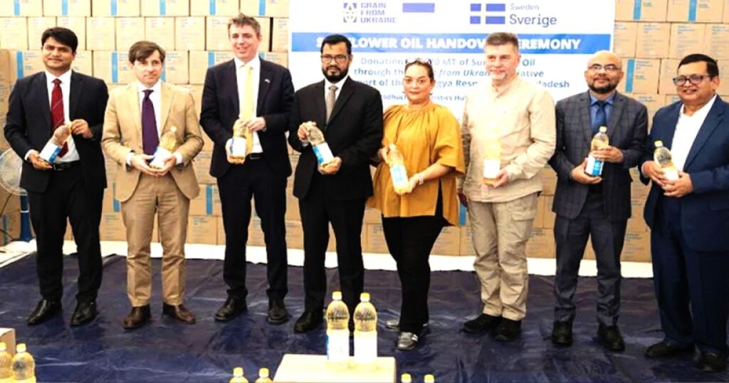 মিয়ানমার থেকে বাস্তুচ্যুত রোহিঙ্গা জনগোষ্ঠীর জন্য খাদ্য সহায়তা জোরদার করতে ইউক্রেনের মানবিক উদ্যোগ ‘গ্রেইন ফ্রম ইউক্রেন’ কর্মসূচির আওতায় বাংলাদেশের জন্য ৩ হাজার মেট্রিক টন সূর্যমুখী তেল আনুষ্ঠানিকভাবে হস্তান্তর করা হয়েছে। এই গুরুত্বপূর্ণ সহায়তা কক্সবাজারের উখিয়ার মধুরছড়া লজিস্টিক হাবে এক আয়োজিত অনুষ্ঠানে বাংলাদেশ, ইউক্রেন, সুইডেনের দূতাবাস এবং জাতিসংঘের বিশ্ব খাদ্য কর্মসূচি (ডব্লিউএফপি) যৌথভাবে গ্রহণ করে। ডব্লিউএফপির এক সংবাদ বিজ্ঞপ্তি অনুযায়ী, এই সূর্যমুখী তেল সম্পূর্ণ ইউক্রেনে উৎপাদিত এবং এর ক্রয় ও পরিবহনসহ মোট খরচ পড়েছে প্রায় ৭০ লাখ মার্কিন ডলার, যা সুইডেন সরকার বহন করেছে। এই তেলটি এখন রোহিঙ্গা শিবিরে চালিত খাদ্য সহায়তা কার্যক্রমে ব্যবহৃত হবে। অনুষ্ঠানে উপস্থিত ছিলেন দুর্যোগ ব্যবস্থাপনা ও ত্রাণ মন্ত্রণালয়ের সচিব মোস্তফিজুর রহমান, রোহিঙ্গা ত্রাণ ও প্রত্যাবাসন কমিশনার মিজানুর রহমান, পররাষ্ট্র মন্ত্রণালয়ের দক্ষিণ এশিয়া উইংয়ের পরিচালক এ.কে. এম. মহিউদ্দিন কায়েস, বাংলাদেশের ইউক্রেনের রাষ্ট্রদূত ড. ওলেক্সান্দ্র পলিশচুক, সুইডেনের রাষ্ট্রদূত নিকোলাস উইকস, ডব্লিউএফপি বাংলাদেশের ভারপ্রাপ্ত কান্ট্রি ডিরেক্টর সিমোন পার্চমেন্ট ও ফ্রান্সের রাষ্ট্রদূত জঁ-মার্ক সেরে শারলে। উল্লেখ্য, ফ্রান্সও এই ‘গ্রেইন ফ্রম ইউক্রেন’ কর্মসূচির অংশীদার। দ্যুৎ্যরোধে সচিব মোস্তফিজুর রহমান বলেছেন, সুইডেন ও ইউক্রেনের এই সহযোগিতা রোহিঙ্গাদের খাদ্য নিরাপত্তা নিশ্চিত করতে এক গুরুত্বপূর্ণ পদক্ষেপ, যা মানবীয় মূল্যবোধ, সহমর্মিতা ও বৈশ্বিক দায়িত্ববোধের প্রতিফলন। রোহিঙ্গা ত্রাণ কমিশনার মিজানুর রহমান উল্লেখ করেছেন, এই যৌথ উদ্যোগ মানবিকতার ওপর আস্থা প্রকাশ করে এবং বাংলাদেশ, ইউক্রেন, সুইডেন, ফ্রান্স ও ডব্লিউএফপিকে একত্রিত করেছে। পররাষ্ট্র মন্ত্রণালয়ের মহিউদ্দিন কায়েস বলেন, এই সহায়তা কেবল মানবিক উদ্যোগ নয়, এটি রোহিঙ্গাদের প্রতি আন্তরিক বন্ধুত্ব ও সংহতির প্রমাণ। ইউক্রেনের রাষ্ট্রদূত ড. পলিশচুক বলেন, সুইডেন ও অন্যান্য অংশীদারদের সমর্থন ছাড়া এই ধরনের উদ্যোগ সম্ভব নয়; তিনি বাংলাদেশের নেতৃত্ব ও ডব্লিউএফপির কার্যক্রমের প্রশংসা করেন। সুইডেনের রাষ্ট্রদূত নিকোলাস উইকস বলেন, রোহিঙ্গা সংকট বিশ্ববাসীর জন্য একটি গুরুত্বপূর্ণ বিষয় এবং এই ধরনের সহায়তা আন্তর্জাতিক সংহতির শক্তিশালী উদাহরণ। ডব্লিউএফপির সিমোন পার্চমেন্ট বলেন, ইউক্রেন ও সুইডেনের এই সহযোগিতা বৈশ্বিক একতার একটি চমৎকার দৃষ্টান্ত এবং ভবিষ্যতে অন্যান্য দেশকেও এগিয়ে আসার আহ্বান জানায়। অনুষ্ঠানে শেষে অতিথিরা ডব্লিউএফপির খাদ্য বিতরণ কেন্দ্র পরিদর্শন করেন, যেখা