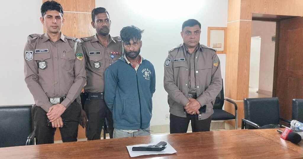 গাজীপুরের টঙ্গীতে একটি বিদেশি পিস্তল ও ম্যাগাজিনসহ যুবককে গ্রেফতার করেছে পুলিশ। রবিবার রাতে, টঙ্গীর পূর্ব আরিচপুর এলাকায় অভিযান চালিয়ে যুবক আব্দুল্লাহ আল মামুন ওরফে রতন (৩০) কে আটক করে পুলিশ। তার কাছ থেকে ওই সময়ে একটি বিদেশি পিস্তল এবং ম্যাগাজিন উদ্ধার করা হয়। একই দিন সকালে গাজীপুর মেট্রোপলিটন পুলিশের নিরাপত্তা ও অপরাধদমন বিভাগের উপ পুলিশ কমিশনার মহিউদ্দিন আহমেদ এ ব্যাপারে বিস্তারিত তথ্য দিয়েছেন। গ্রেপ্তারকৃত মামুন লালমনিরহাট জেলার খোটামারা গ্রামের মৃত-আবেদ আলীর ছেলে। তিনি মোহাম্মদপুর পশ্চিমপাড়া এলাকার এক বাসায় ভাড়া থাকতেন। পুলিশ জানায়, গোপন সংবাদের ভিত্তিতে টঙ্গী পূর্ব থানার ওসি তুহিন মিয়া ও সহকারী ওসি রুহুল আমিনের নেতৃত্বে দক্ষিণ বিভাগের অপরাধ দমন টিম অভিযান চালিয়ে তাকে গ্রেফতার করে। পরে তার দেওয়া তথ্য অনুযায়ী, পূর্ব আরিচপুরের সাবেক কাউন্সিলর শাহ আলম রিপনের বাড়ির ভাড়াটিয়ার ঘরে অভিযান চালিয়ে পিস্তল ও ম্যাগাজিন উদ্ধার করা হয়। এ ব্যাপারে সংশ্লিষ্ট আইনে মামলা দায়ের করে তাকে আদালতে পাঠানো হয়েছে।