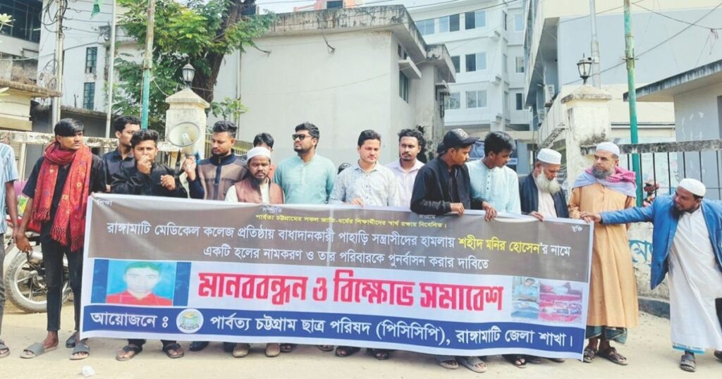 বক্তারা জানান, রাঙামাটিতে মেডিকেল কলেজের সূচনাকালীন সময়ে ছাত্র সংগঠন পাহাড়ি ছাত্র পরিষদের সদস্য মনির হোসেনকে নিষ্ঠুরভাবে হত্যা করা হয়। তাদের দাবি, এই হত্যাকাণ্ডের জন্য জড়িতদের বিচার সম্পন্ন হয়নি এবং মনিরের পরিবারের কোনও সরকারি সুবিধাও এখনো পায়নি। তিনি হত্যার আত্মত্যাগের কারণেই রাঙামাটিতে মেডিকেল কলেজ প্রতিষ্ঠা সম্ভব হয়েছে বলে তারা বলেন।
