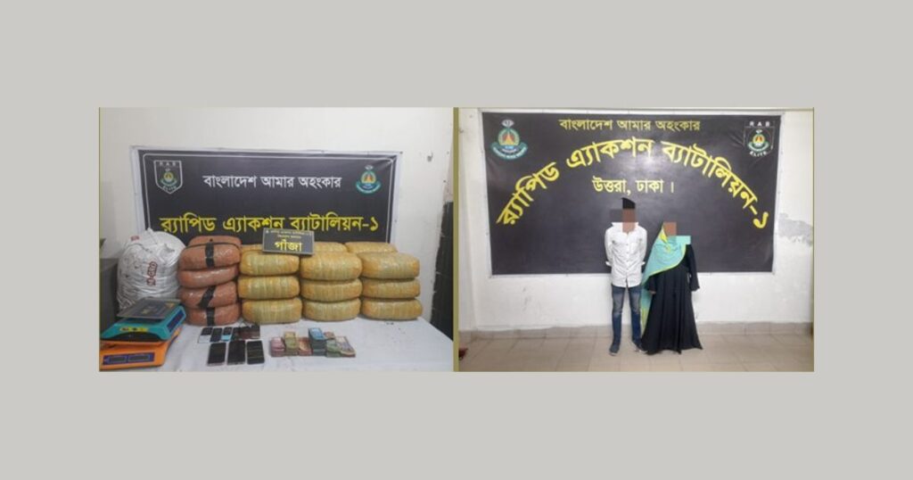 র‍্যাবের অভিযানকালে তাদের বাসা তল্লাশি করে συνο ৮১ কেজি গাঁজা এবং মাদক বিক্রির কাজে ব্যবহৃত নগদ ১ লাখ ৮৭ হাজার ৪০০ টাকা উদ্ধার করা হয়। র‍্যাব-১ এর সিনিয়র সহকারী পরিচালক (মিডিয়া অফিসার) রাকিব হাসান রবিবার দুপুরে এক সংবাদ বিজ্ঞপ্তির মাধ্যমে এই তথ্য নিশ্চিত করেছেন।
