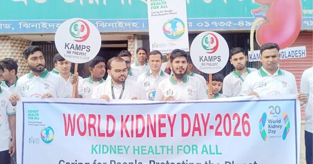 ‘সবার জন্য সুস্থ কিডনি — মানুষের যত্নে বাঁচাও ধরণী’ প্রতিপাদ্যে ঝিনাইদহে পালিত হয়েছে বিশ্ব কিডনি দিবস। বৃহস্পতিবার (১২ মার্চ) সকালে শহরের কেন্দ্রীয় বাস টার্মিনাল এলাকা থেকে ক্যাম্পস কিডনি ও ডায়ালাইসিস সেন্টারের আয়োজনে একটি সচেতনা র‌্যালি বের করা হয়।